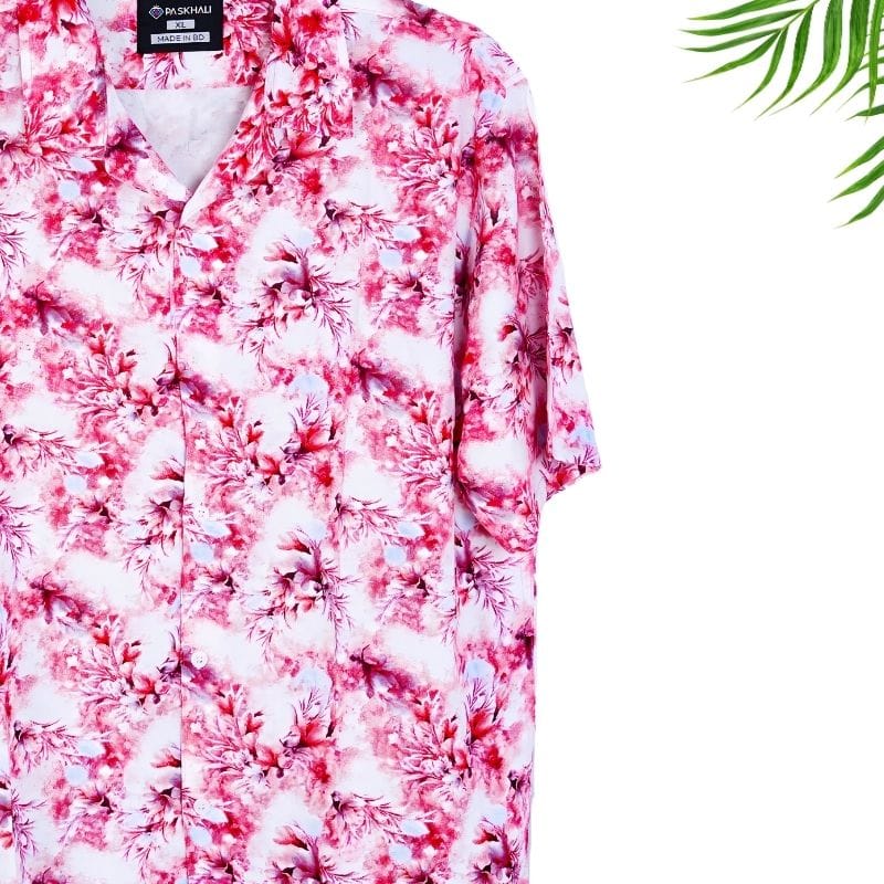 এই গরমে, শুধু জামা না — পরুন এক্সপ্রেশনের ভাষা। Feel cool, look cooler – with Paskhali’s premium Hawaiian drop-shoulder Pink-White Flower shirt.